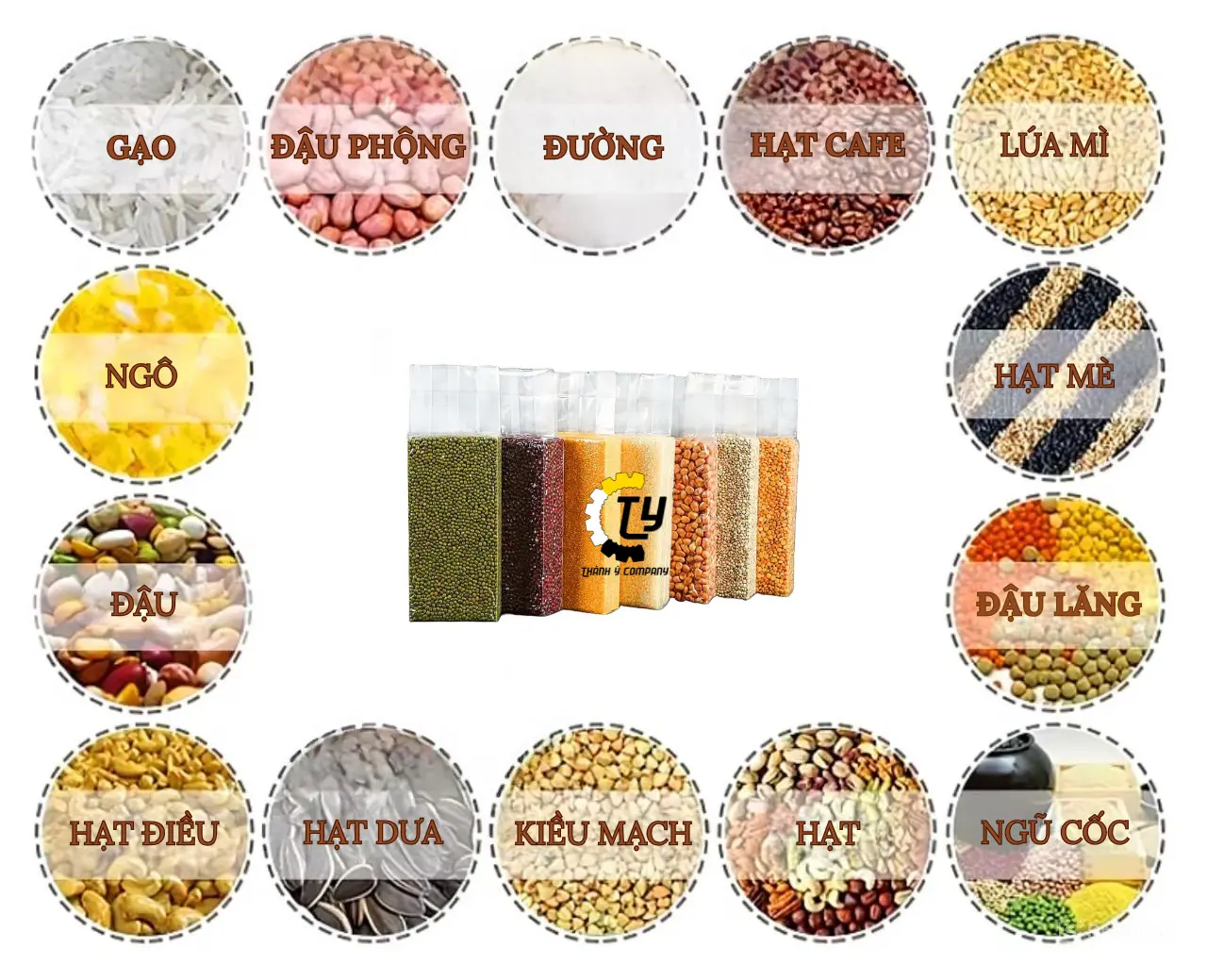 - Hạt giống và nông sản: Đóng gói hạt giống, ngô, lúa mì, phân bón, và các sản phẩm nông sản khác.
