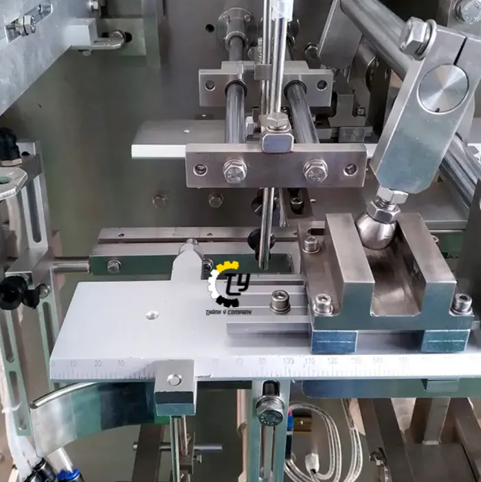 Kéo căng túi: Khi túi đã được chiết đầy sữa, bộ phận kéo căng túi sẽ kéo túi ra để tạo không gian đóng gói rộng rãi, giúp quá trình hàn miệng túi diễn ra chính xác.