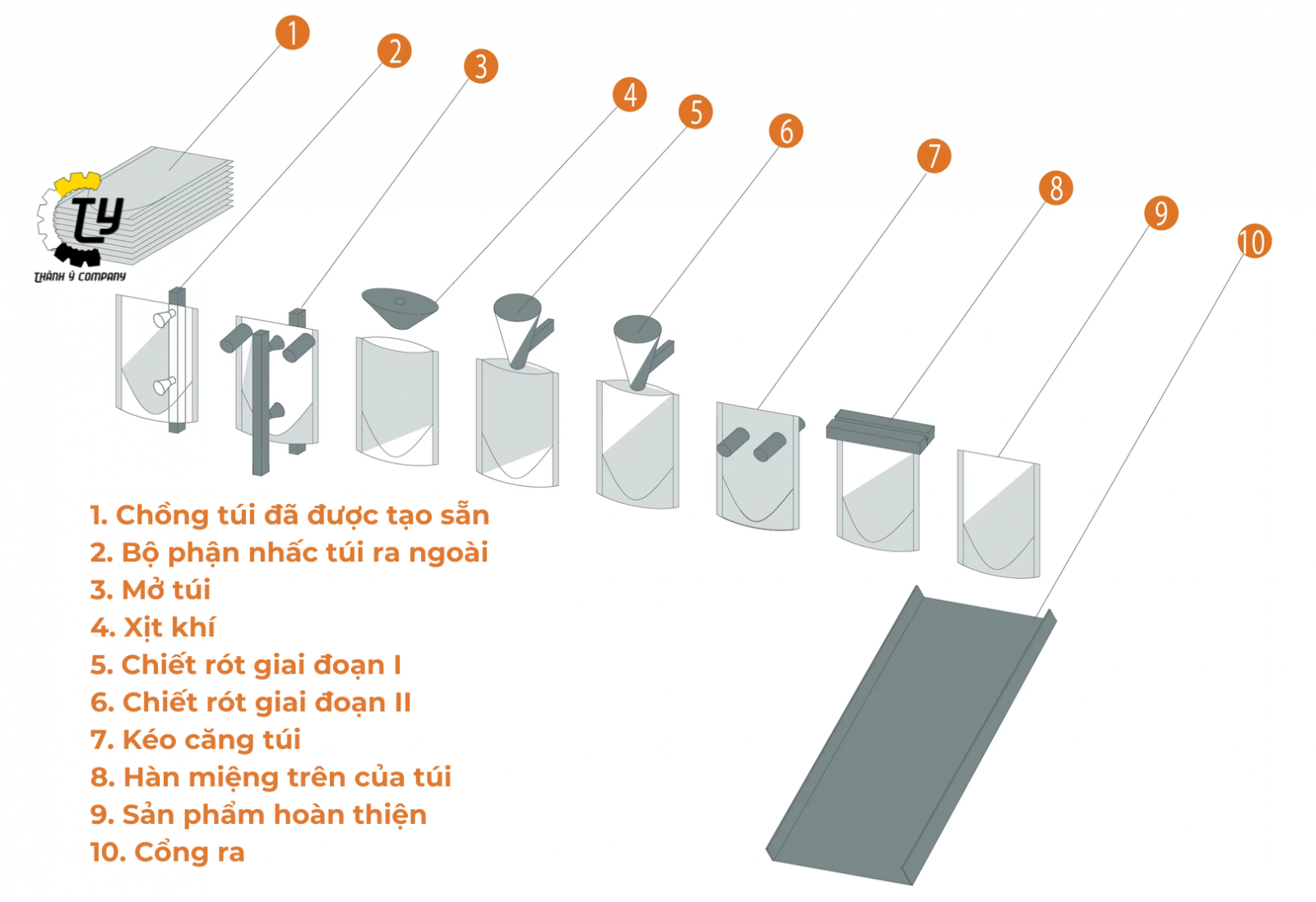 Xuất sản phẩm: Túi sữa hoàn chỉnh sẽ được đưa ra ngoài qua cổng xuất sản phẩm, sẵn sàng để đi vào quá trình đóng thùng hoặc vận chuyển.