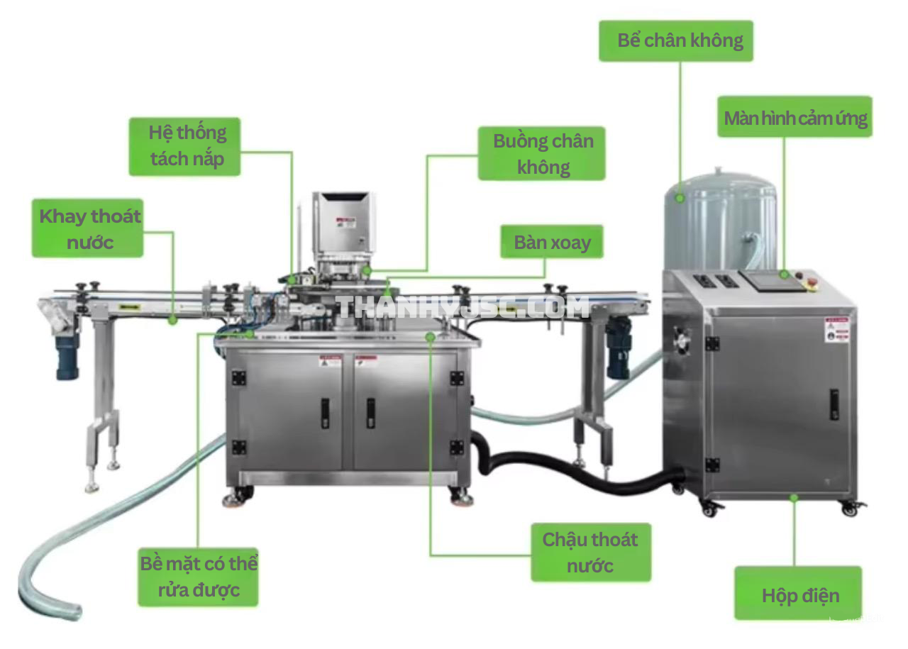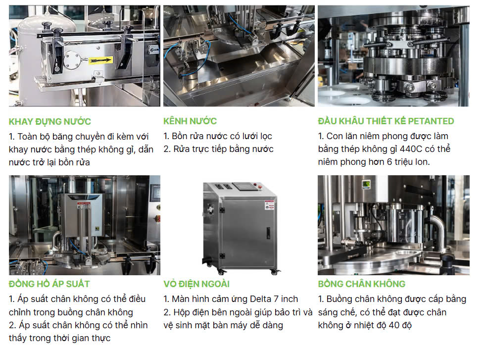 Máy đóng nắp chân không cho lon nước ngọt là thiết bị chuyên dụng trong ngành công nghiệp thực phẩm và đồ uống, được thiết kế để đóng kín nắp lon với độ chính xác cao. Máy hoạt động bằng cách hút chân không bên trong lon trước khi đóng nắp, đảm bảo sản phẩm được bảo quản lâu hơn, giữ nguyên chất lượng và hương vị.