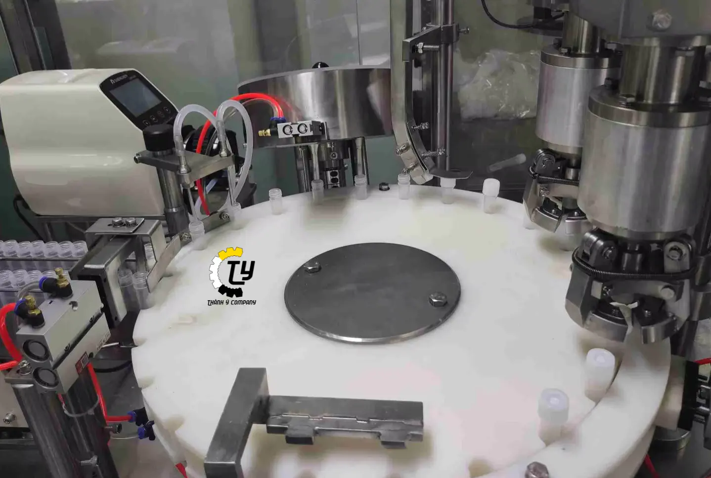 Tự động hóa hoàn toàn: Máy thực hiện các bước như xếp ống nghiệm, điền chất lỏng, đóng nắp và dán nhãn một cách tự động, giúp tiết kiệm thời gian và nhân công.