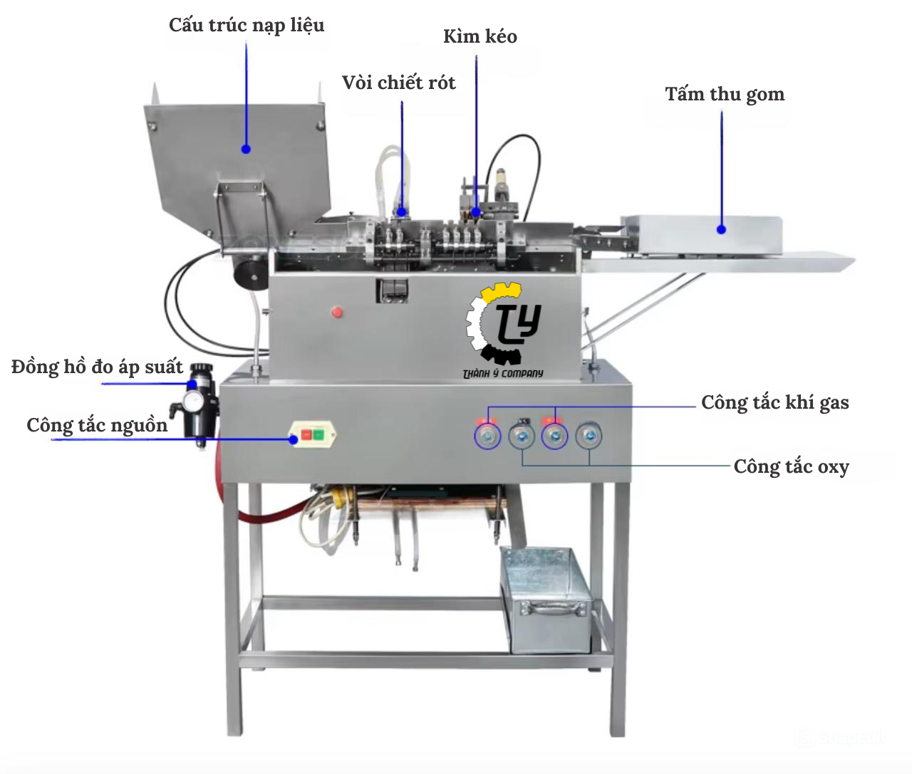 Tất cả các bộ phận này kết hợp với nhau để thực hiện quá trình chiết rót và hàn kín ống thủy tinh một cách tự động, nhanh chóng và chính xác.