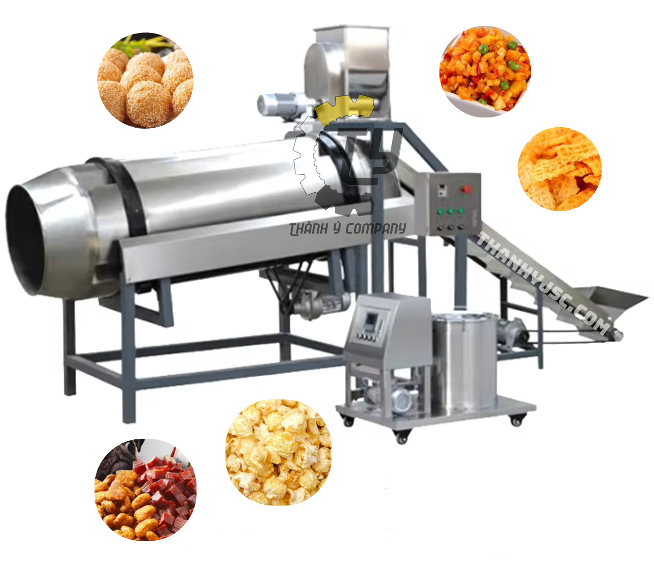 Máy phủ gia vị tự động là thiết bị tiên tiến dùng để ướp gia vị hoặc phủ lớp gia vị lên các loại thực phẩm như snack, khoai tây chiên, đậu, hạt, bánh phô mai, thức ăn cho thú cưng, và nhiều loại đồ ăn vặt khác. Máy giúp tăng năng suất sản xuất, đảm bảo chất lượng gia vị đồng đều, tiết kiệm thời gian và nhân công.