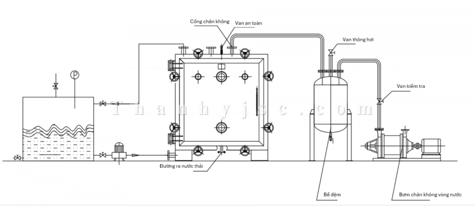 Sau khi sản phẩm cần sấy được đặt vào buồng sấy chân không, bơm chân không được kích hoạt, bắt đầu hút không khí ra khỏi buồng sấy. Việc tạo ra môi trường chân không làm giảm áp suất bên trong buồng sấy làm giảm điểm sôi của nước bên trong sản phẩm, tạo điều kiện thuận lợi cho quá trình bay hơi của nước. Đồng thời, nước trong bể chứa được đun nóng. Nước nóng tuần hoàn qua hệ thống ống dẫn nhiệt được thiết kế thành các giá đặt khay sấy. Nhiệt lượng được truyền vào buồng sấy làm tăng nhiệt độ của sản phẩm thúc đẩy quá trình tách ẩm của vật liệu sấy. Dưới tác động của nhiệt và áp suất thấp, nước trong sản phẩm bắt đầu bay hơi. Hơi nước được tạo ra sẽ nhanh chóng khuếch tán vào môi trường chân không. Bơm chân không tiếp tục hoạt động, hút hơi nước này ra khỏi buồng sấy và dẫn vào bể đệm. Tại bể đệm, hơi nước ngưng tụ lại thành nước lỏng.