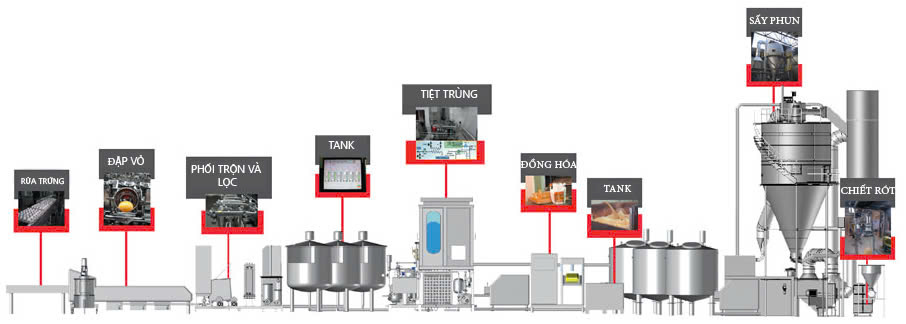 Lòng đỏ và lòng trắng được phối trộn theo tỷ lệ mong muốn, có thể thêm nước hoặc các thành phần khác tùy theo yêu cầu sản phẩm.