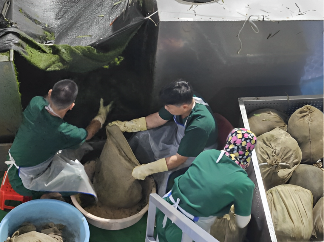 Lá tre nghiền sẽ được đựng trong các túi lọc và bước vào giai đoạn chiết xuất