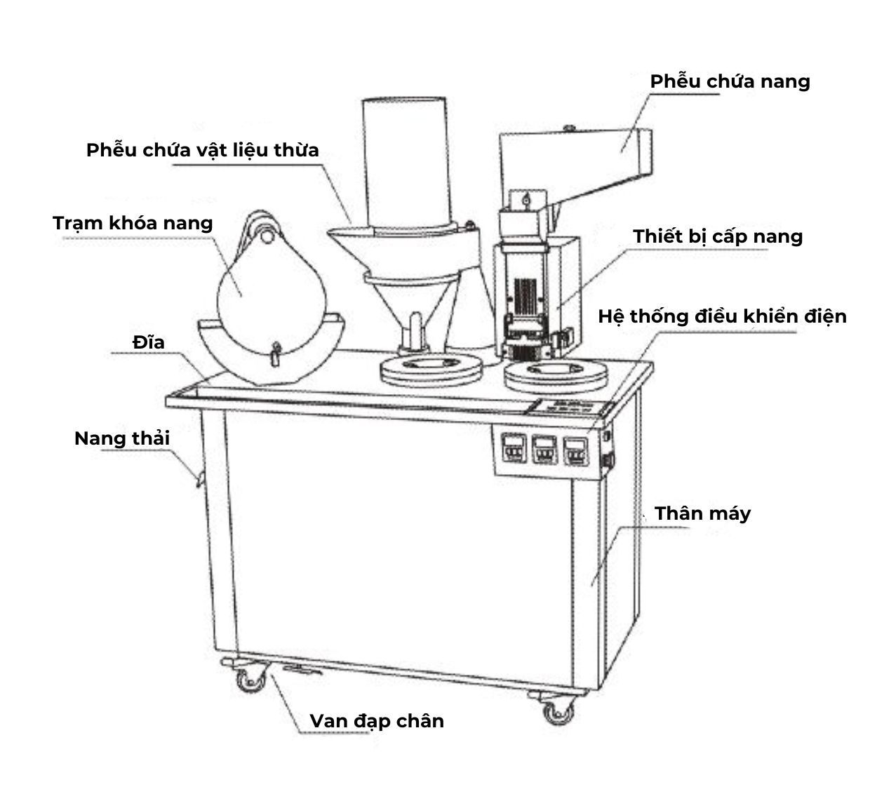 Máy đóng nang, dù tự động hay bán tự động, đều có cấu tạo bao gồm các bộ phận chính sau: