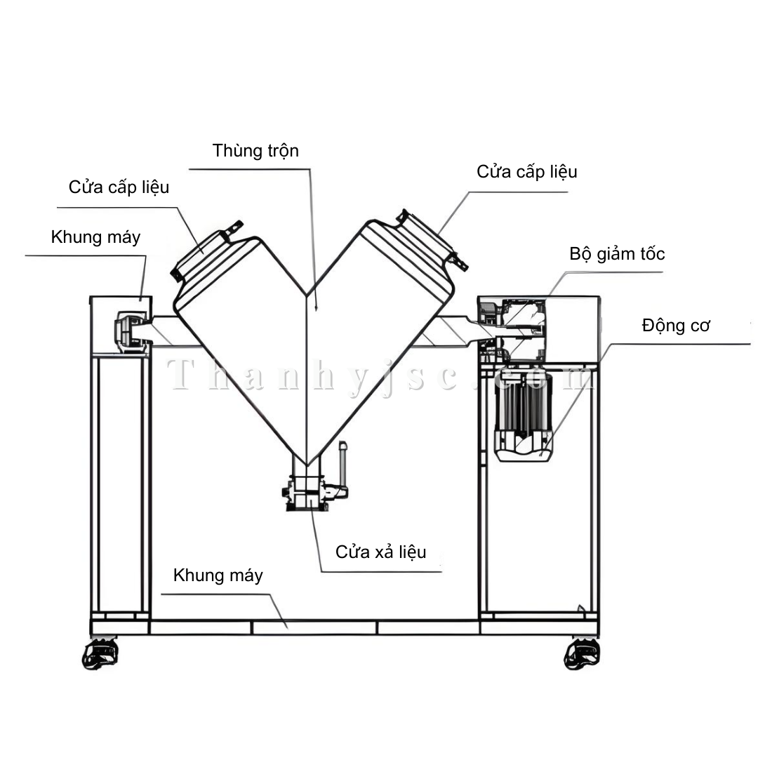 Máy trộn chữ V có cấu tạo gồm hai phần chính là hai hình nón được ghép lại với nhau, tạo thành một khoang trộn hình chữ V. Nguyên liệu được đưa vào khoang trộn thông qua các cửa nạp liệu. Khi máy hoạt động, hai hình nón sẽ quay ngược chiều nhau quanh một trục chung, tạo ra lực ly tâm và ma sát mạnh mẽ. Lực này giúp các hạt vật liệu va chạm vào nhau liên tục, từ đó trộn đều các thành phần.