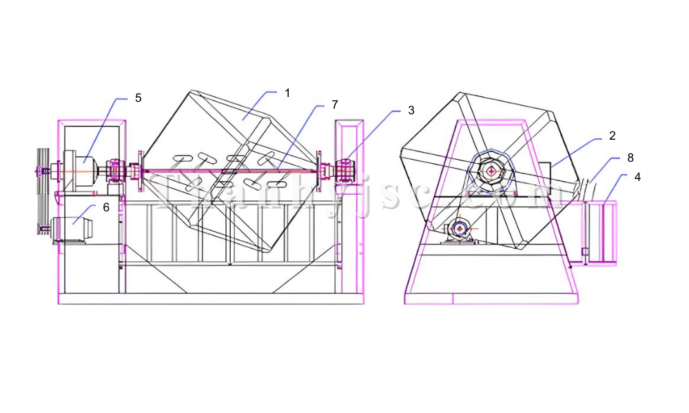 Khi máy hoạt động, động cơ sẽ truyền lực quay cho trục trung tâm, làm cho thùng hình lập phương quay đều xung quanh trục này. Đồng thời, các cánh trộn bên trong thùng cũng quay theo, tạo ra một chuyển động hỗn hợp phức tạp.