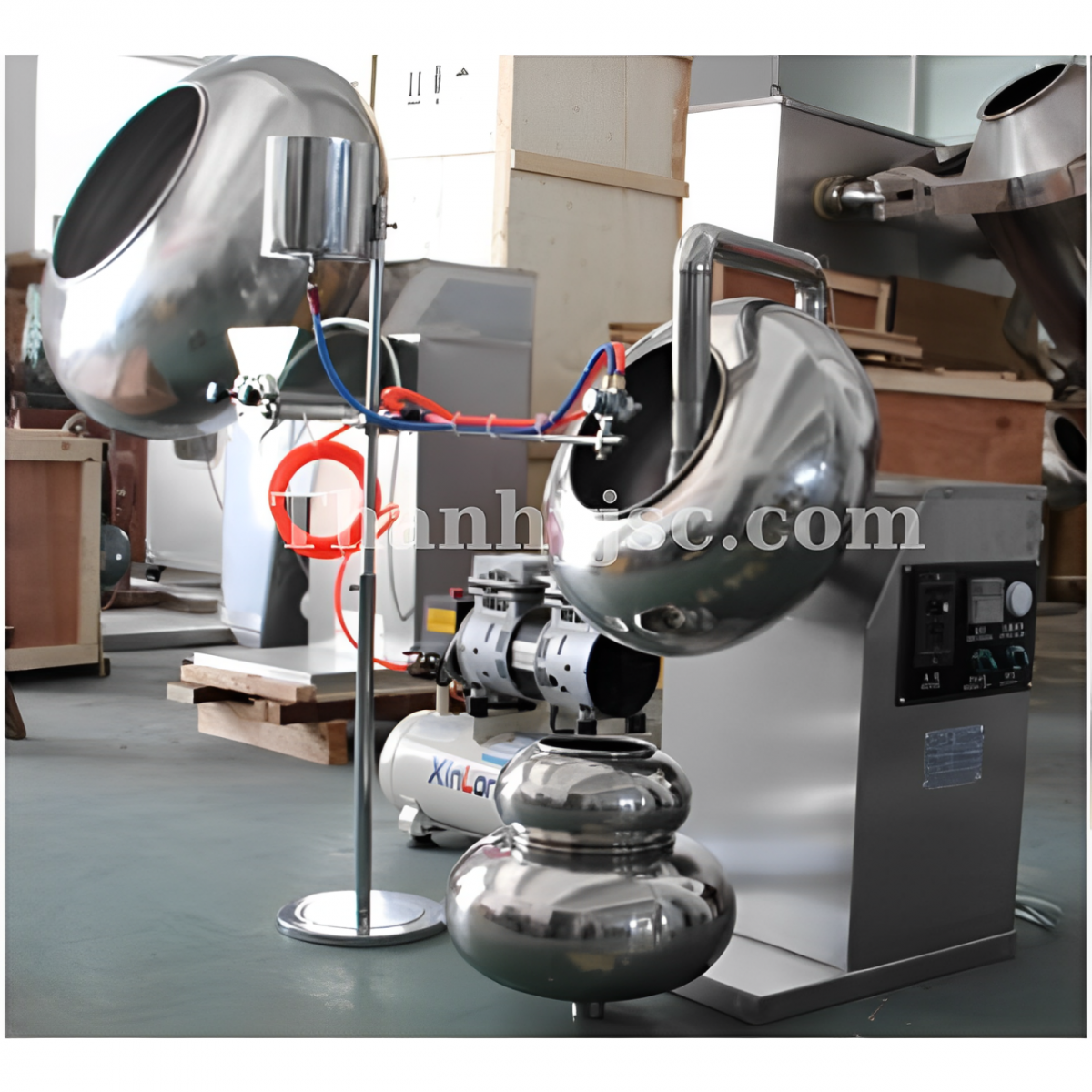 - Chảo bao đường: Quay đều viên thuốc, giúp dung dịch bao phủ đồng nhất.